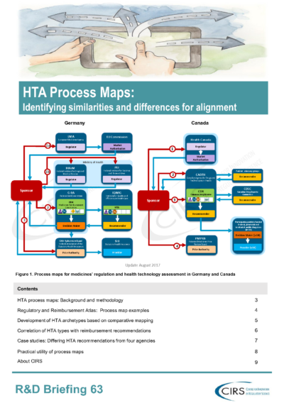 This R&D Briefing summarises the background and methodology of process mapping with examples to demonstrate the steps involved in regulatory, HTA and coverage processes for new medicines. Process maps have been created for more than 75 jurisdictions and are available on an online platform called CIRS Regulatory and Reimbursement Atlas. The Atlas serves as an educational and visual communication tool to facilitate the explanation and comparison of different jurisdictions to multiple stakeholders. It has also been used to address a number of research questions and some of these studies are discussed in this R&D Briefing.