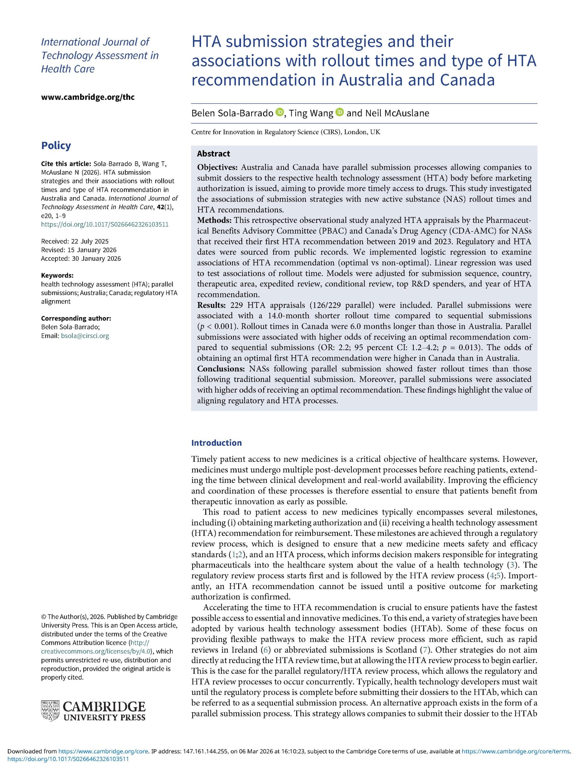 - Parallel submissions were associated with higher odds of receiving an optimal first HTA recommendation (defined as a positive or positive with restrictions recommendation).